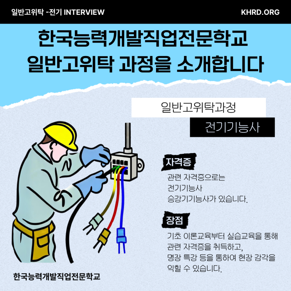 한국능력개발직업전문학교에는 일반고 위탁 과정이 크게 2가지로 나뉩니다! 전기 기능사 양성 과정과, 미용:헤어/네일/메이크업 자격취득 과정이 있어요. 특히 전기기능사 과정은 한 번 자격증을 취득해두면, 이후 대체되기 어려운 전문직종이라 여러 좋은 점이 있습니다! 경력이 쌓이다보면 연봉도 수직상승하는 곳이기도 하고 자격증의 유무로 어떤 업무를 담당하게 되는지 차이도 생기지요.