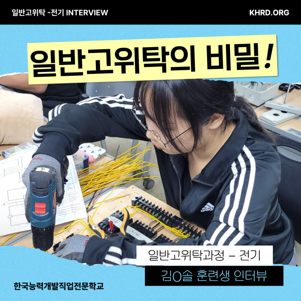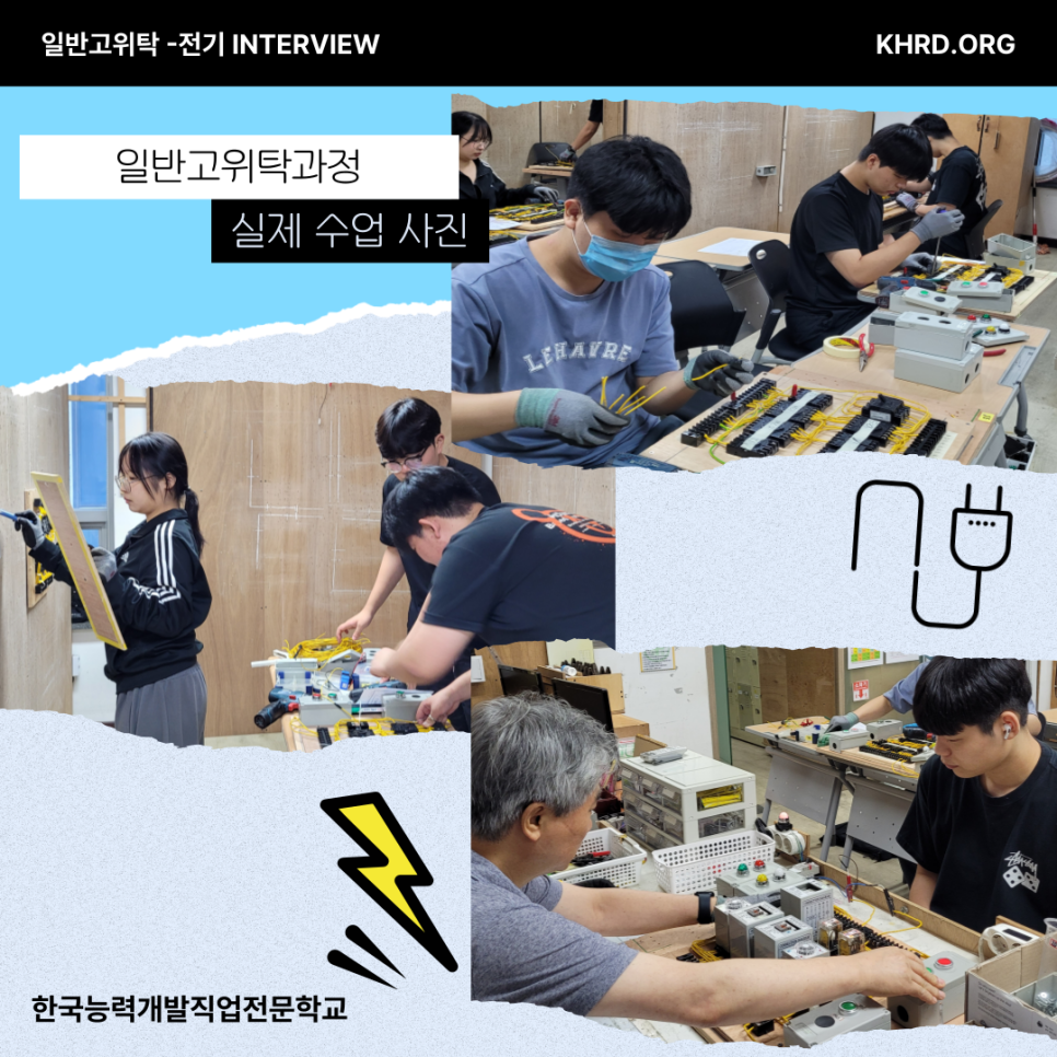 실제 수업시간에는 실기 외에 필기도 공부합니다! 교수님께서 알려주시는 문제로 준비하면 전기기능사 필기 시험도 어렵지 않아요~! 자신이 만든 실습 완성물은 사진으로 남겨, 잘못된 게 있다면 꼭 체크하고 잘한 부분은 앞으로도 유지할 수 있게 노력합니다! 아래는 전기 기능사 반에서 실제로 배우고 있는 학생의 인터뷰입니다!